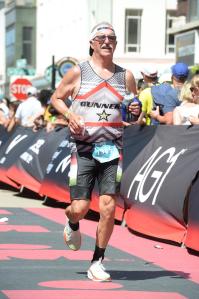 My mood/energy/pace was picking up as I came through to end the first lap and continue on to the second lap of the run. I tried to jog longer and at least jog from aid station to aid station, but I needed another break along the path that runs along the river. This was a hot section of the run course for me, but the “Sprinkler Alley” area followed along soon, and I was getting a boost from being closer to the finish.