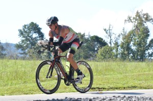 Amazingly enough, I had a sun screen can in my bag. It’s less necessary at this part of the race, but I sprayed my bald head and arms anyway. With the bib belt, shoes and visor on, I grabbed my nutrition and started out of transition.