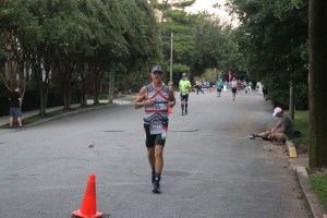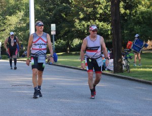 It wasn’t long and Gunner Jeff caught me. I knew he would. We would leap frog back and forth sharing the run lead for the rest of the way, but seeing that he had made up the difference in what little lead I had with the swim and bike, I knew that he was ahead of me by chip time even if he was standing right next to me. The same thing happened last time as well, it just happened sooner this year. He’s good.