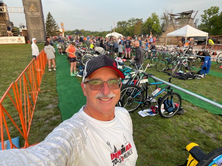 Getting up at 4 am is never easy, but I got up, ate, and then I drove to Lemont and parked at the Lemont High School parking lot, as the participant guide indicated that parking was limited at the Forge and it was really easy to park at the school and ride my bike to the park. Once that I got there, I found the rack for my bike and got my transition all set up.