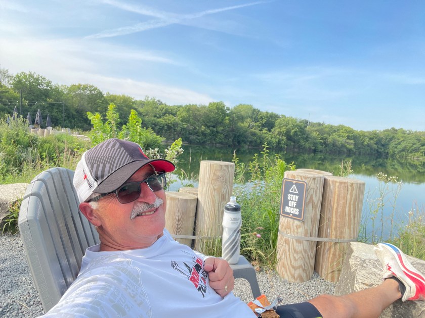 As I drove over a very potholed road into The Forge on Friday to pick up my race packet, I was reminded that this road is part of the course, and it was going to need my full attention on race day. I was up at 4 am on Saturday to get ready for the race. The drive to Lemont was an easy trip and I parked in my usual spot at Lemont HS and rode my bike into the park along the I & M Canal trail. Once there I racked my bike, set up my transition area, then started taking in the important Swim Out, Bike Out, and Run Out portions of transition. That led me to discover that the run-out now takes a narrow path, winding around and eventually dumping you on the trail. I decided a warm-up jog was in order, and headed down the trail to see what parts were changed and what to expect. I saw my friend Tony walking down the path and we exchanged pleasantries. He was there to volunteer as a lifeguard in a kayak, which is very much appreciated. He has a super-packed race schedule this year, so I was a little surprised that he finds time to volunteer for stuff like this.